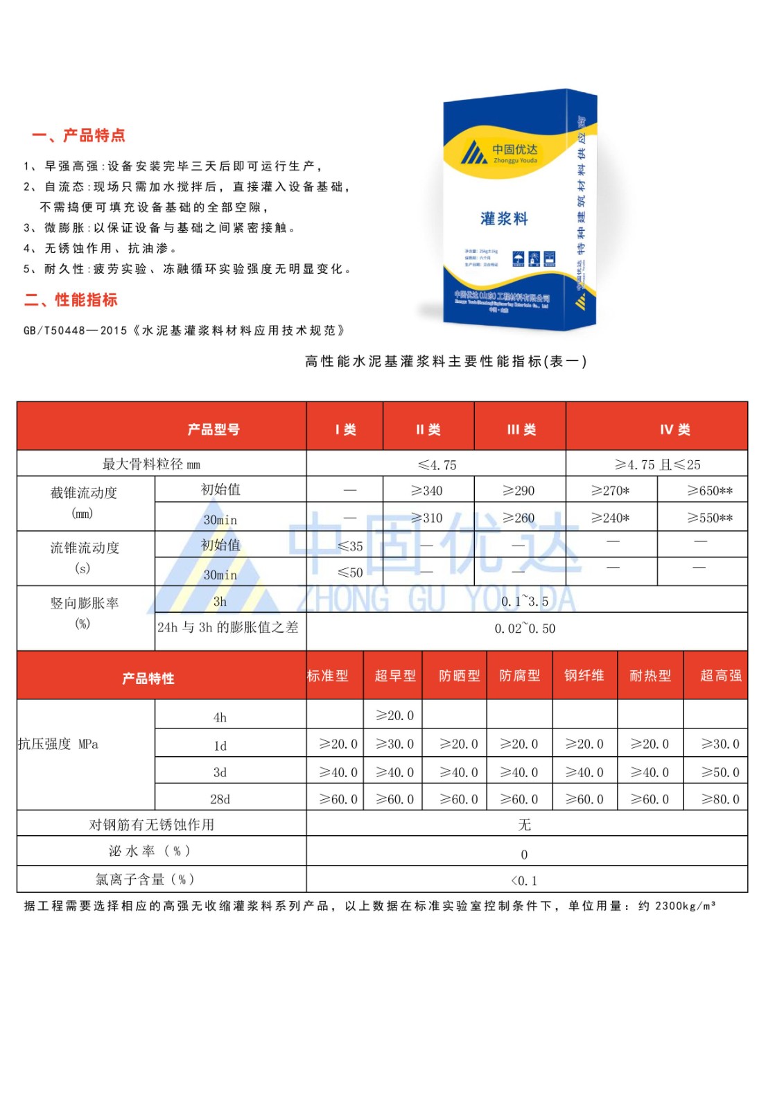 早強(qiáng)、高強(qiáng)、抗離析、綠色環(huán)保、微膨脹性、自流性好、粘結(jié)度高、耐久性強(qiáng)、抗開裂等